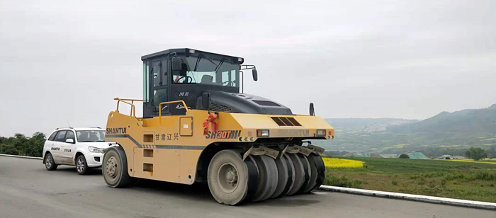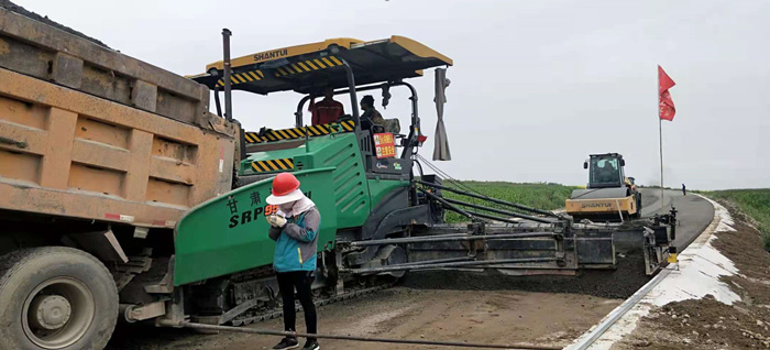 在甘肅省某道路上,山推攤鋪機和壓路機等成套路面施工設(shè)備正有條不紊地進(jìn)行水穩(wěn)層施工,山推SRP 95-3大厚度攤鋪機,一次攤鋪10.5米,攤鋪作業(yè)厚度35mm,攤鋪速度快,離析低、平整度高;山推壓路機緊跟攤鋪機進(jìn)行壓實作業(yè),壓實質(zhì)量完全達(dá)到規(guī)范要求。山推路面設(shè)備以其高質(zhì)量、高效率贏得當(dāng)?shù)乜蛻舻膹V泛好評。