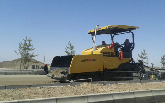 山推SRP95M攤鋪機在甘肅XX戈壁灘進行公路基層施工,此設備噪聲低,排放少,強勁的動力系統(tǒng)能夠滿足各種工況,在此項目中高效完成作業(yè)。